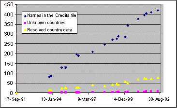 Longitudinal analyses of the Credits files also have to deal with the problem of address changes. For example, in the early Credits files Linus Torvalds has an address in Finland. In 1997 he moved to Santa Clara, California, and the address information changed accordingly. When Credits files are used to analyze the country of origin of developers, the results therefore show a decrease in the Finnish population of kernel developers in 1998. Similar changes have occurred in many countries. In some cases the countries themselves have changed. Furthermore, some entries contain multiple addresses in different countries — for example, when the person in question is temporarily studying or working abroad.