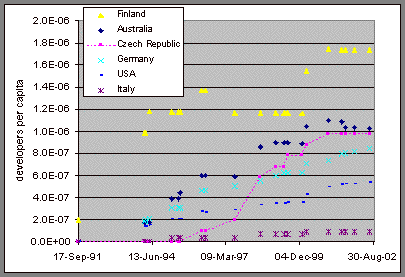 Already a quick glance at Figure 3 produces several alternative hypotheses to the thesis that opportunity costs or wages in the local software industry can explain country differences in the Linux developer community. Finland seems to rank high partly because of the historic origin on Linux. The most important distribution host in the early years of the Linux history was funet.fi, located in Finland. As many Finnish hackers had good access to this Internet node, they were well aware of the evolution of the Linux system. The relatively high Finnish participation in the Linux development activity, therefore, seems to be more a story about innovation diffusion than a story about opportunity costs. The facts that Finland ranks highest among the countries in the proportion of science and engineering students [17] and that it was among the first countries to be connected to the U.S. Internet backbone [18] most probably also play a role here.